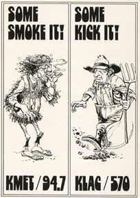 | Pat broadcast three news reports daily - a nooncast and then two reports in afternoon drive, always starting with the bizarre stories and if there was time, he used whatever UPI said was the lead. One day Pat was reading a story about the Drug Enforcement Agency and how the agency had determined that a percentage of the marijuana confiscated at the US/Mexican border contained the urbanize paraquat and should it be smoked by an unsuspecting person, it could cause irreparable lung damage. Pat sounded incredulous when he read the story. “Well, I took that story and added to it – ‘what? Somebody smokes pot that listens to KMET?’ And the story caught fire.” |
